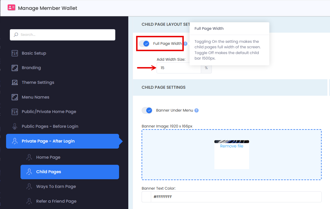 Full Page Width - Toggling On the setting makes the child pages full width of the screen Toggle Off makes the default child bar 1500px